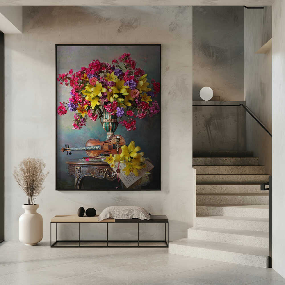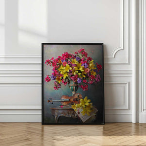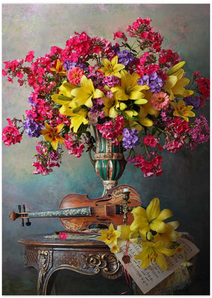 Still life with violin and flowers