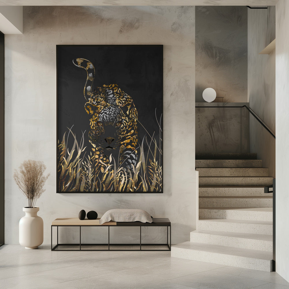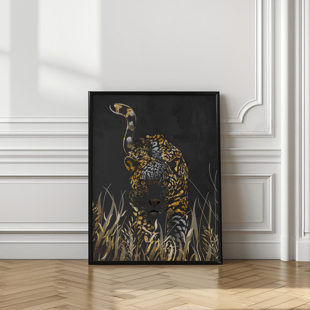 Black gold jaguar in grass by Sarah Manovski