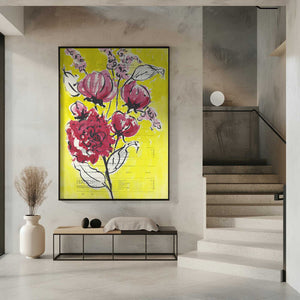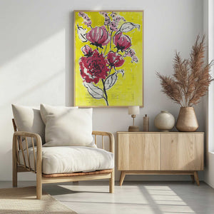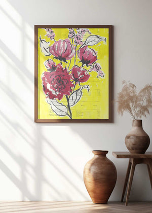 Painted sketch of a rose branch on a yellow background by Annick