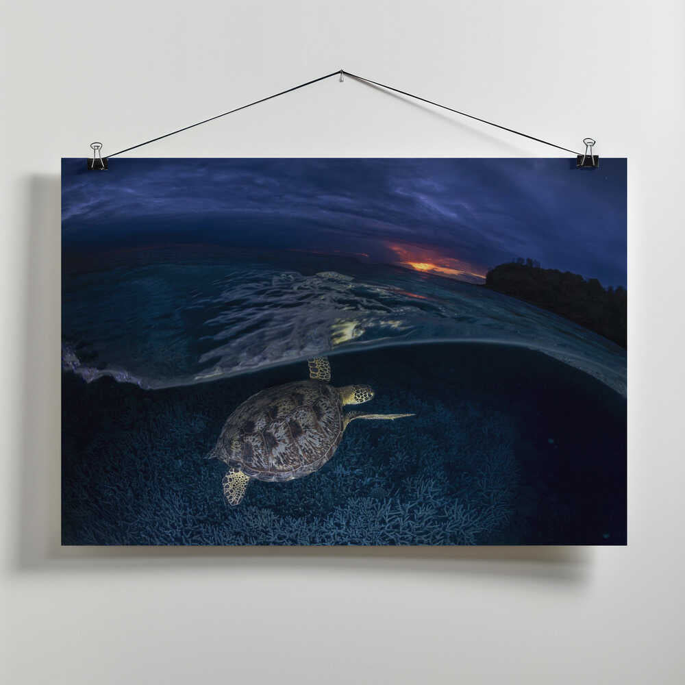 Green turtle at sunset by Barathieu Gabriel