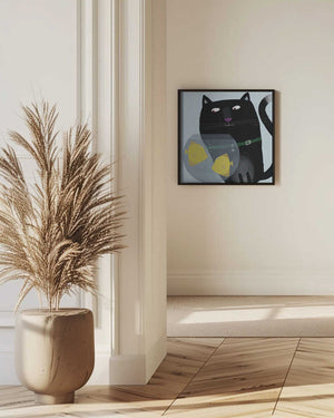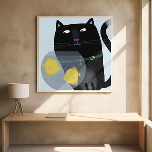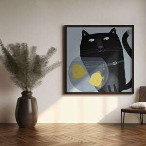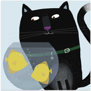 Black Cat Eyeing Up Yellow Fish in fish Bowl by Artist Carla Daly
