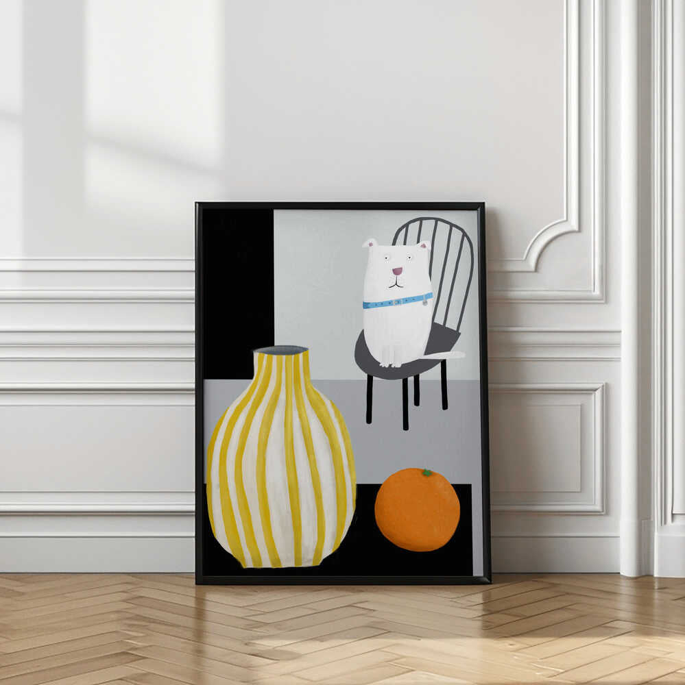 Funny White Dog with Yellow and White Stropped Vase by Carla Daly by Carla Daly