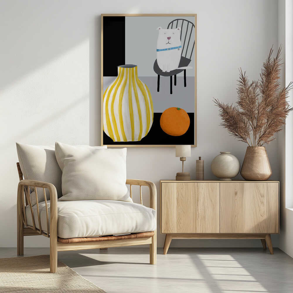 Funny White Dog with Yellow and White Stropped Vase by Carla Daly