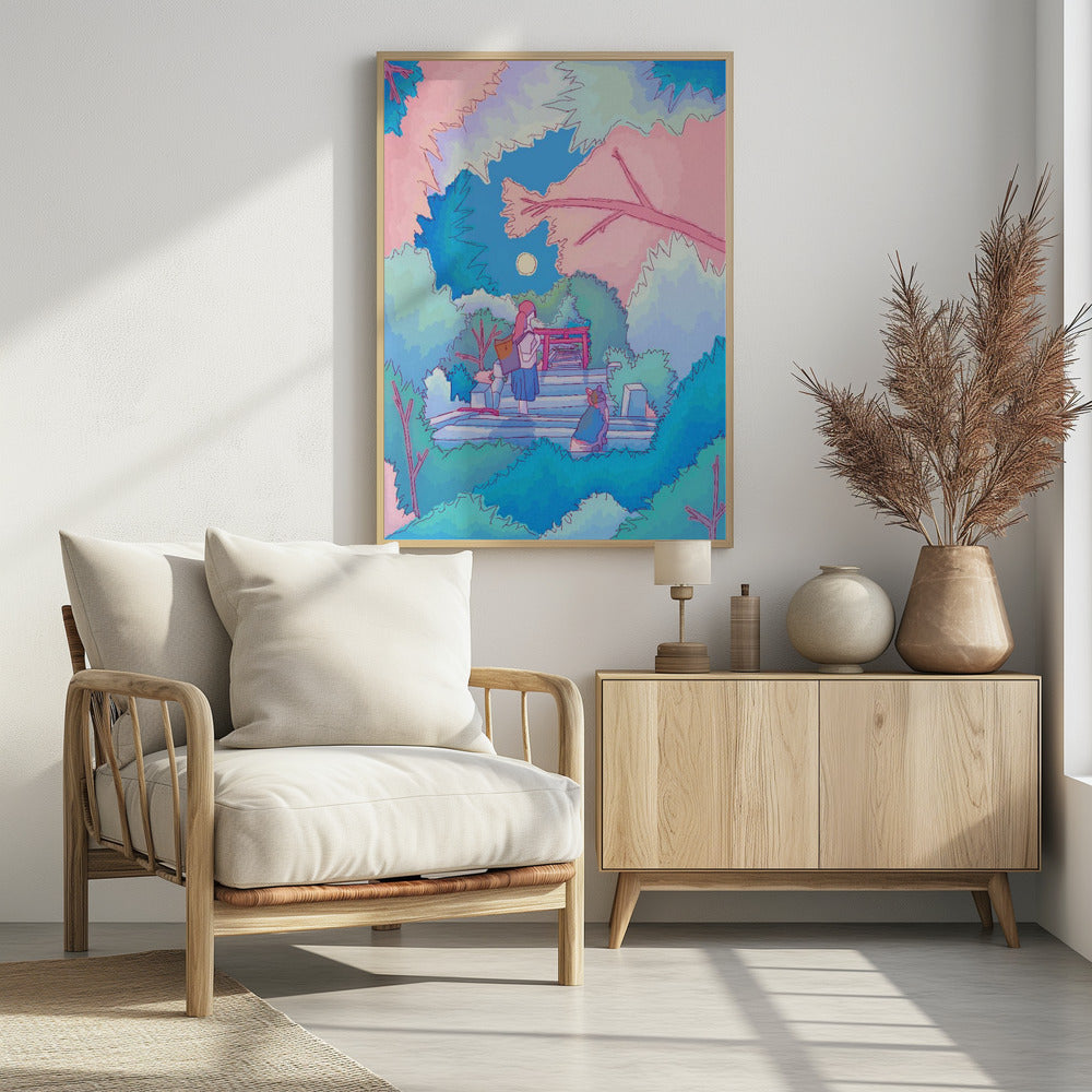 Girl With Her Cat Under A Moonlit Sky