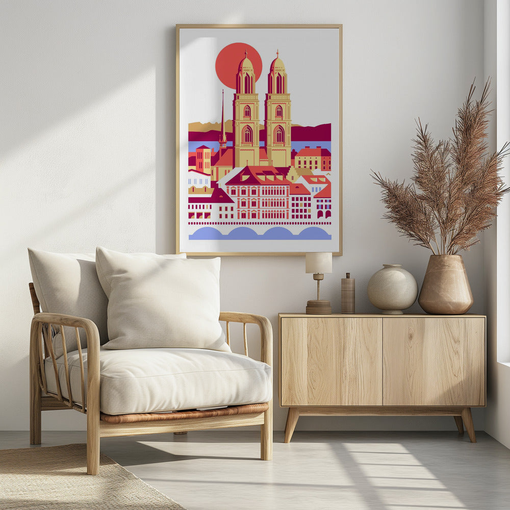 City Of Zurich Switzerland Swiss Summer Mountains City Illustration Vintage Poster